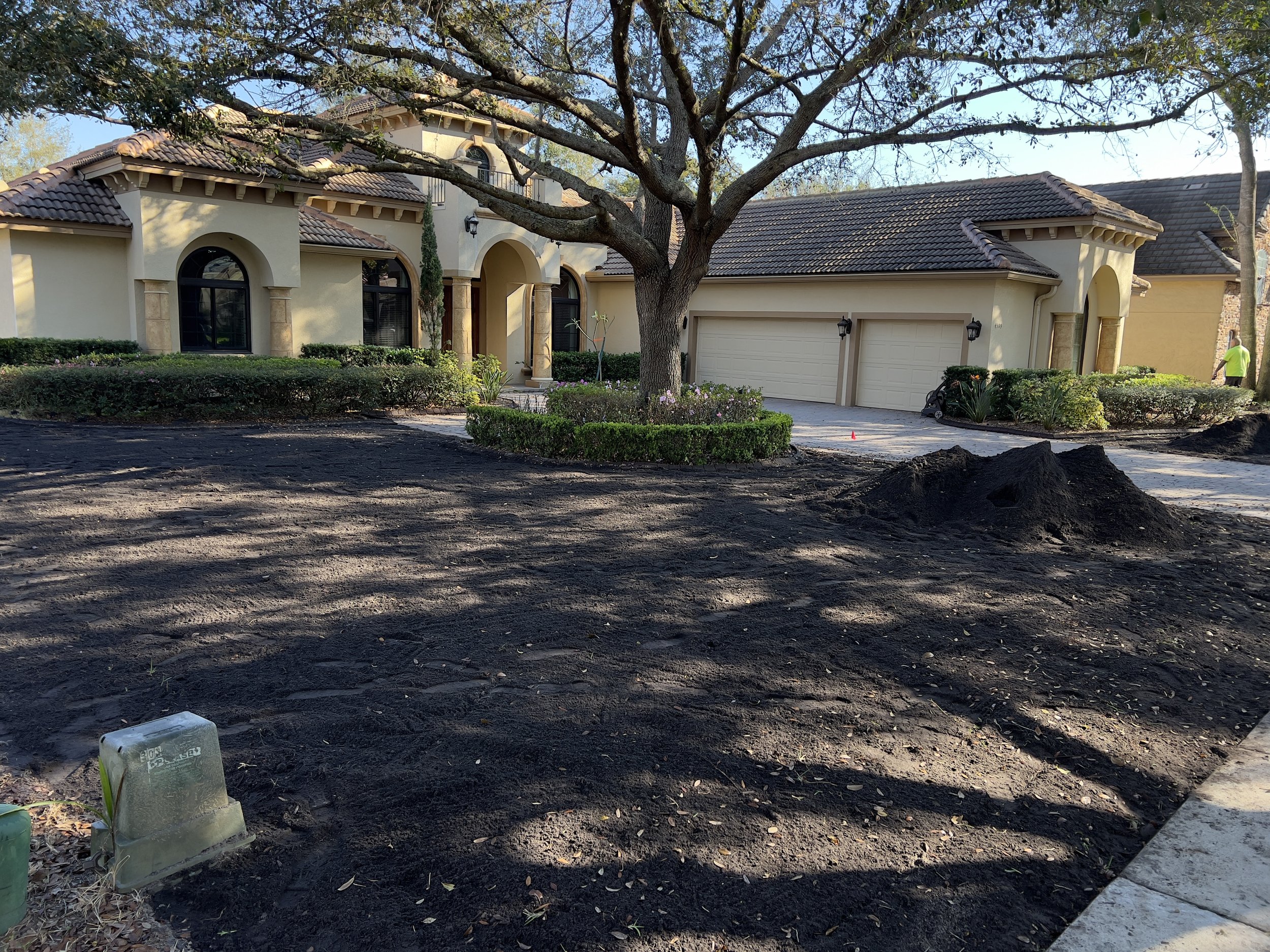 Michael Geist’s Yard Works provides professional soil amendment and final grading as a critical step in the sod installation process for homes throughout Oviedo, Winter Park, Winter Springs, Lake Mary, and surrounding Central Florida areas. Native Florida soils are amended with high-quality, screened compost rich in organic matter to improve soil structure, nutrient availability, and microbial activity, creating an ideal environment for sod root establishment. Where site conditions require it, clean sand is incorporated to assist with leveling, improve drainage, and promote proper water movement within the root zone.
